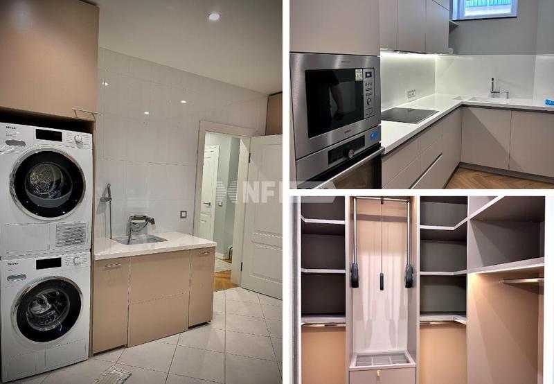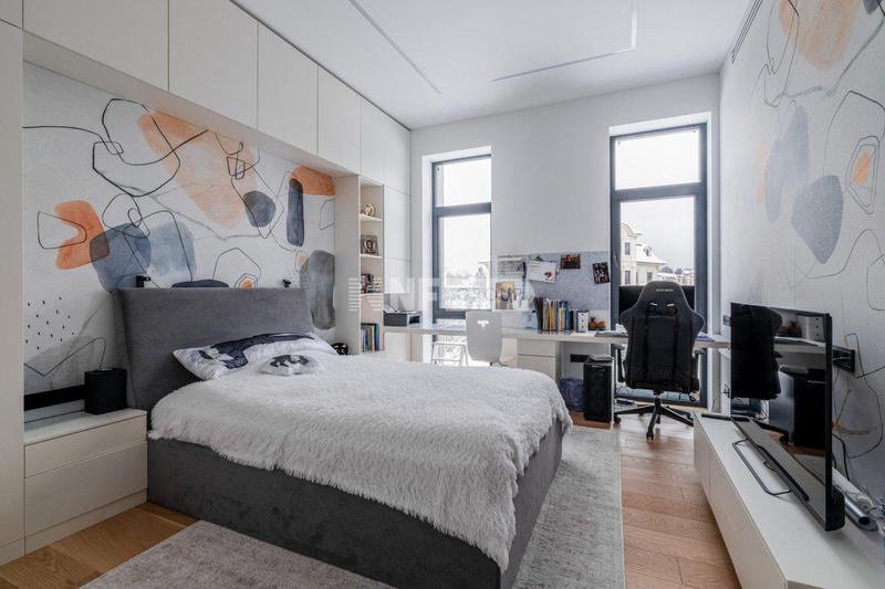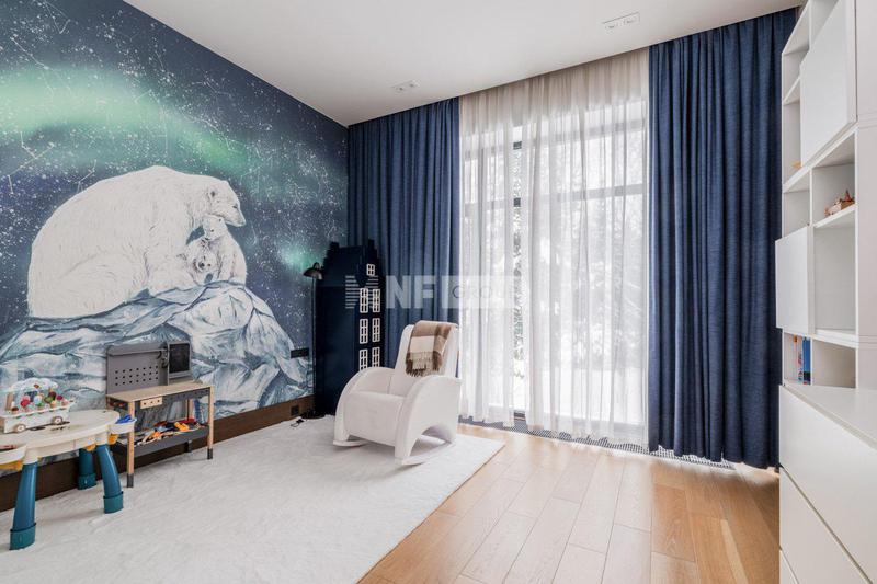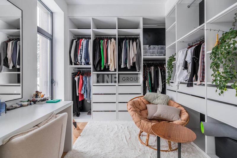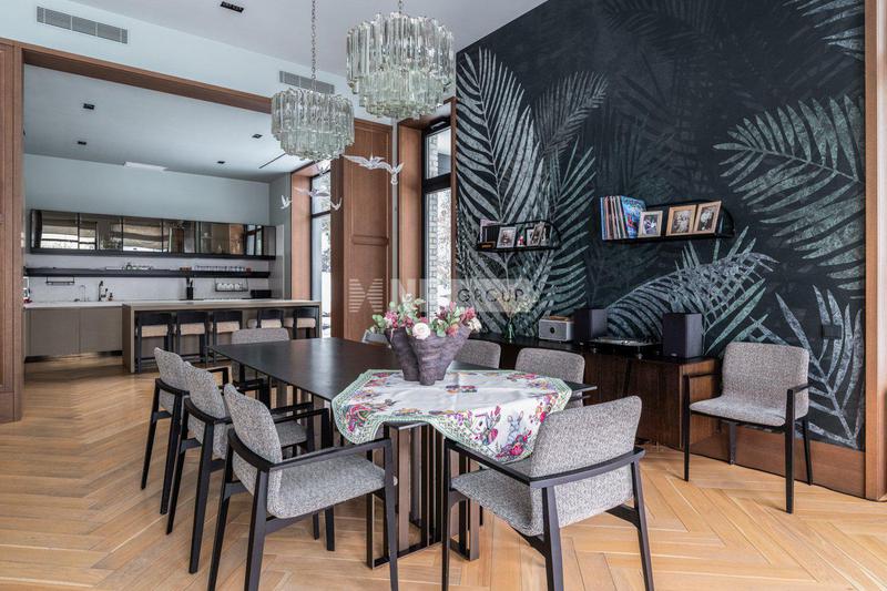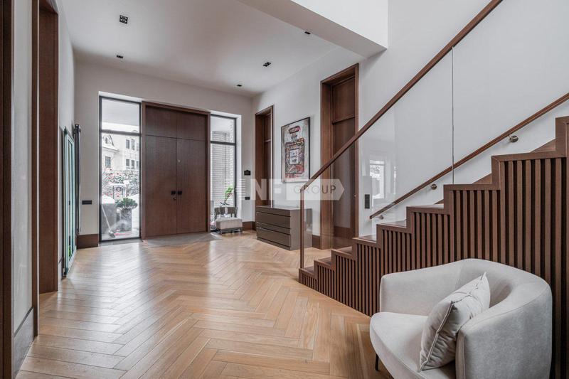 Внутреннее пространство продолжает архитектурную концепцию, соединяя классические элементы с тонкими акцентами ар-деко. Белая кухня с фасадами в традиционном стиле наполняет дом атмосферой домашнего уюта и заботы. В столовой зоне — пара статуй лошадей, добавляющих пространству театральной выразительности. Отдельные детали — ножки торшеров, полки, светильники — украшены золотыми элементами, что придает интерьеру лёгкий налёт роскоши. В спальнях — мягкое зонирование, обои, выбранные с душой, подчеркивают индивидуальность пространства. В этом доме ощущается энергия жизни, история и характер.