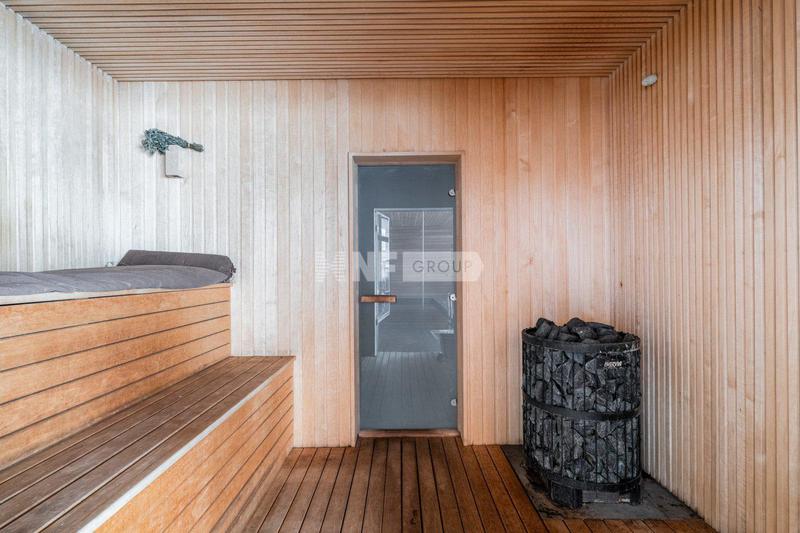 • 1 этаж — холл, гардеробная, кухня-гостиная-столовая с выходом на большую крытую веранду, постирочная, санузел, SPA-зона с сауной, душевой и дополнительным санузлом.
